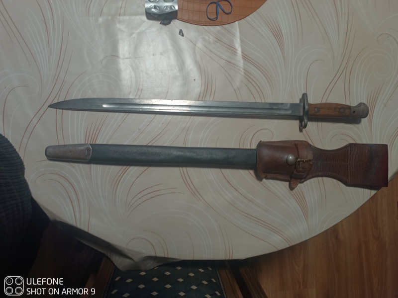 Gut erhaltenes Englisches Bajonett, Lee Enfield P 1907, Lederscheide ist in Ordnung, komplett mit Koppelschuh