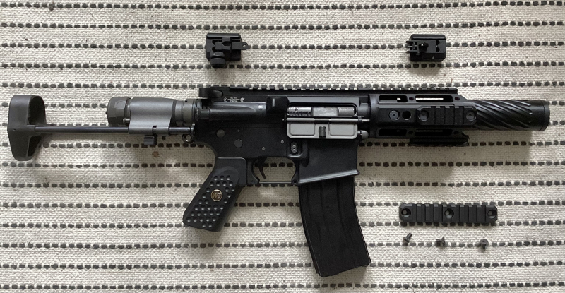 Die Original Front- und Rearsights und die lange RIS-Schiene habe ich nicht montiert und wird natürlich mitgeliefert. Siehe Fotos. Die Airsoft habe ich nur in meiner Sammlung gehabt und eigentlich nicht benutzt.