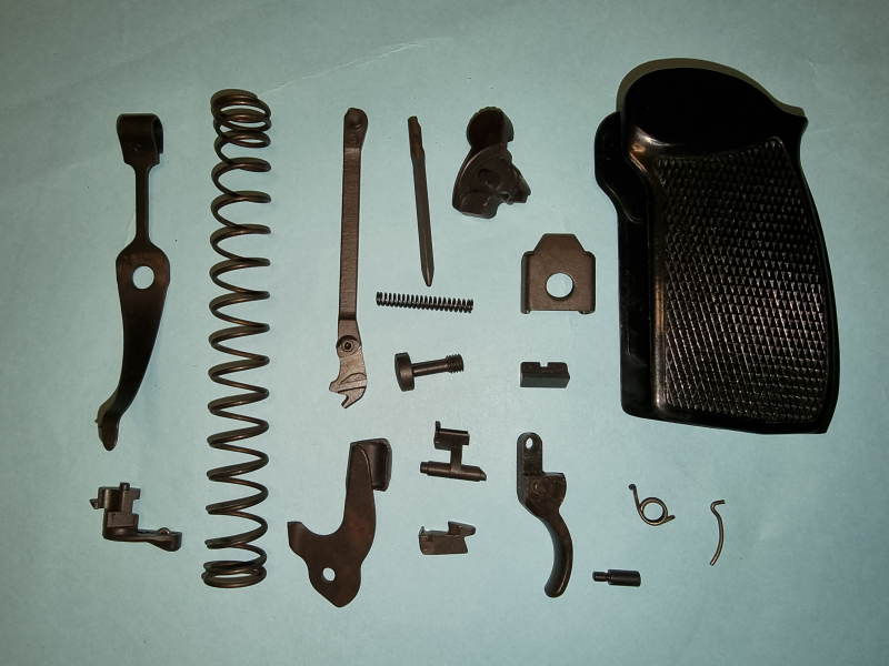 Auszieher, Auszieherbolzen, Auszieherfeder, Visier, Schlagbolzen, Sicherungsfeder, Sicherung, Abzugstollen, Abzugstollen- u. Schlittenfangfeder, Hahn, Abzugstange, Hahnhfeder, Griffschalenschraube (NVA), Griffschale NVA schwarz, Hahnfederhalter, Schlittenfanghebel, Abzug, Vorholfeder