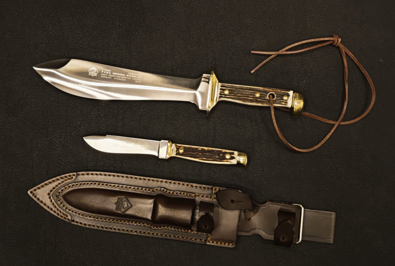 Zum Verkauf steht ein originales PUMA Waidbesteck nach OFM Walter Frevert – bestehend aus dem legendären Waidblatt und dem passenden Jagdnicker.