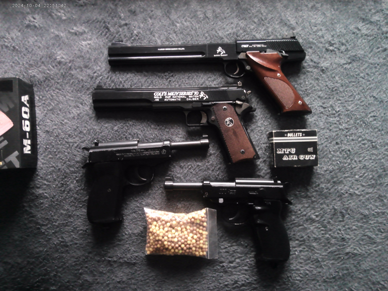 Biete hier 2 Modelpistolen von Colt ,es sind Federdruckpistolen mit Ladehülsen , 2 CO 2 Pistolen ,P 38 Nachbau 338 Auto ,meier Meinung nach von Umarex,und einen Federdruck Revoler 6 mm BBs an. Die Co2 Waffen haben das Kaliber 4,5