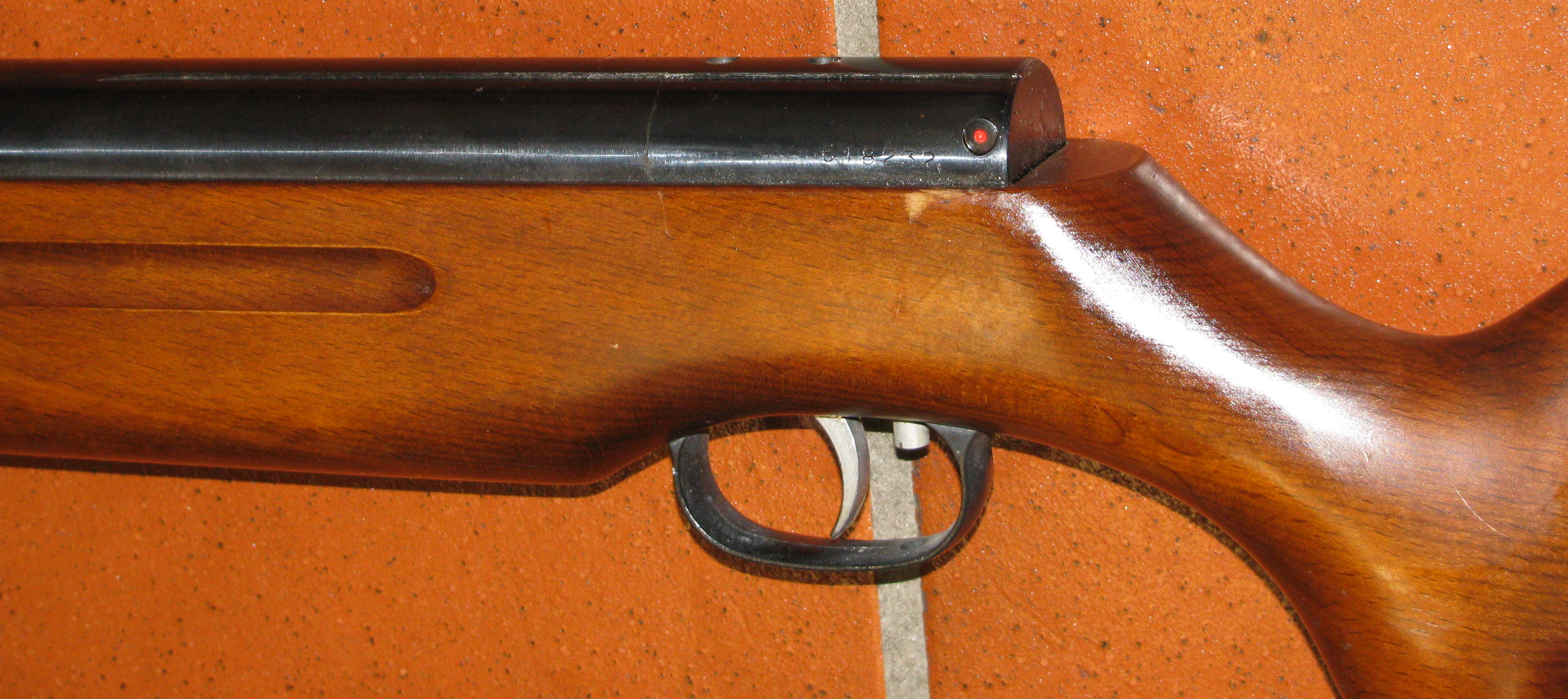 Zum Verkauf kommt ein WEIHRAUCH Luftgewehr, ein WEIHRAUCH HW 35 mit Roter Schaftkappe und F - Zeichen