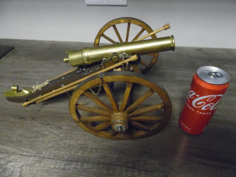 Ziemlich großes und hübsches Modell einer Kanone. Als Größenvergleich habe ich einmal eine Getränke Dose daneben gestellt. Diese ist nicht Bestandteil der Auktion.