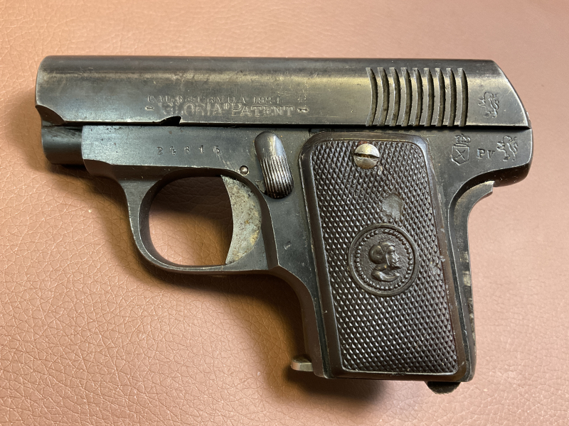Zum Verkauf steht eine Taschenpistole Ermua 1924, Modell Gloria Patent. spanischem Beschuss. Die Waffe hat einen sehr gut erhaltenen blanken Lauf mit sehr guten Zügen und Feldern.