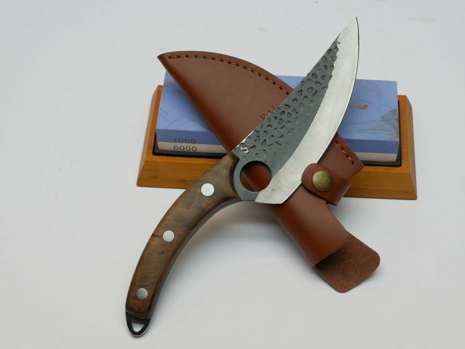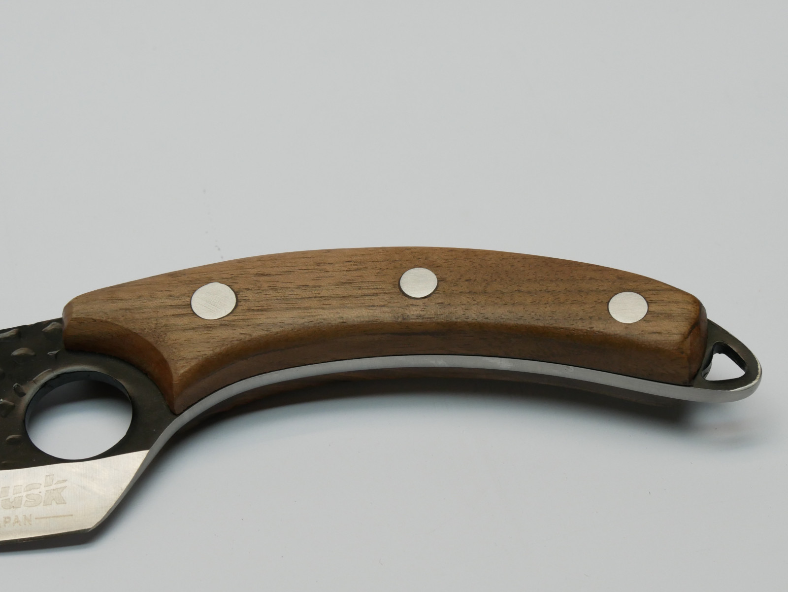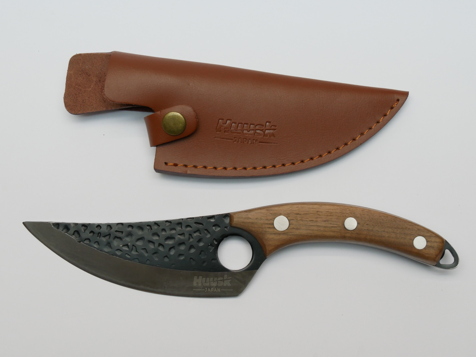 Hier biete ich ein schönes Küchenmesser von Huusk aus Japan in brauner Lederscheide an.