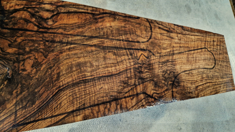 Die ersten drei Fotos wurden auf einem feuchten Holzbrett aufgenommen, um die Muster besser sichtbar zu machen. Das letzte Foto zeigt die Maße in Zentimetern. Die Umrisse wurden auf die tatsächlichen Maße der Blaser F3 übertragen.