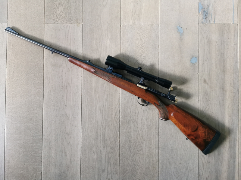 Zum Verkauf kommt eine AKAH 98er-System im Kaliber .243Win mit einem Hubertus Zielfernrohr 6x42. Die Waffe wurde an verschiedenen Systemteilen vergoldet (Zustand siehe Bilder)