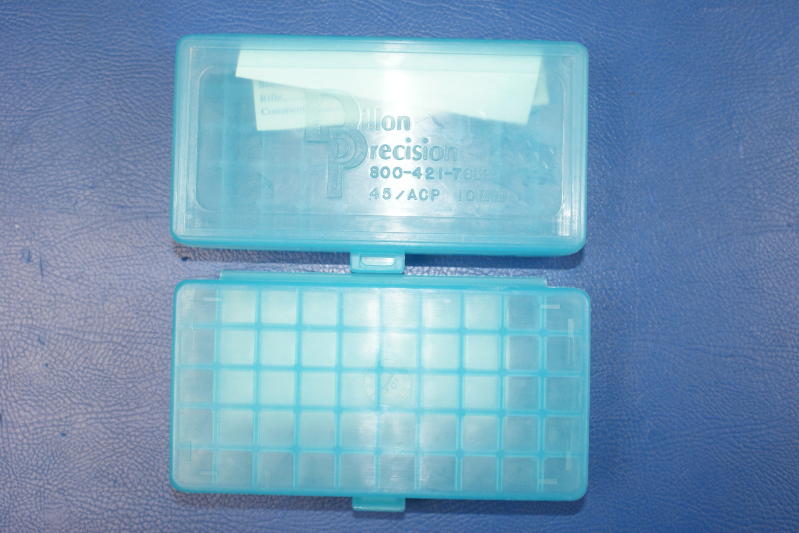 Vier Patronenboxen für je 50 Schuss der Marke Dillon Precision für das Kaliber .45 ACP, 10mm. Die Patronenboxen sind durchsichtig, wodurch die Menge an Patronen von außen ersichtlich ist.