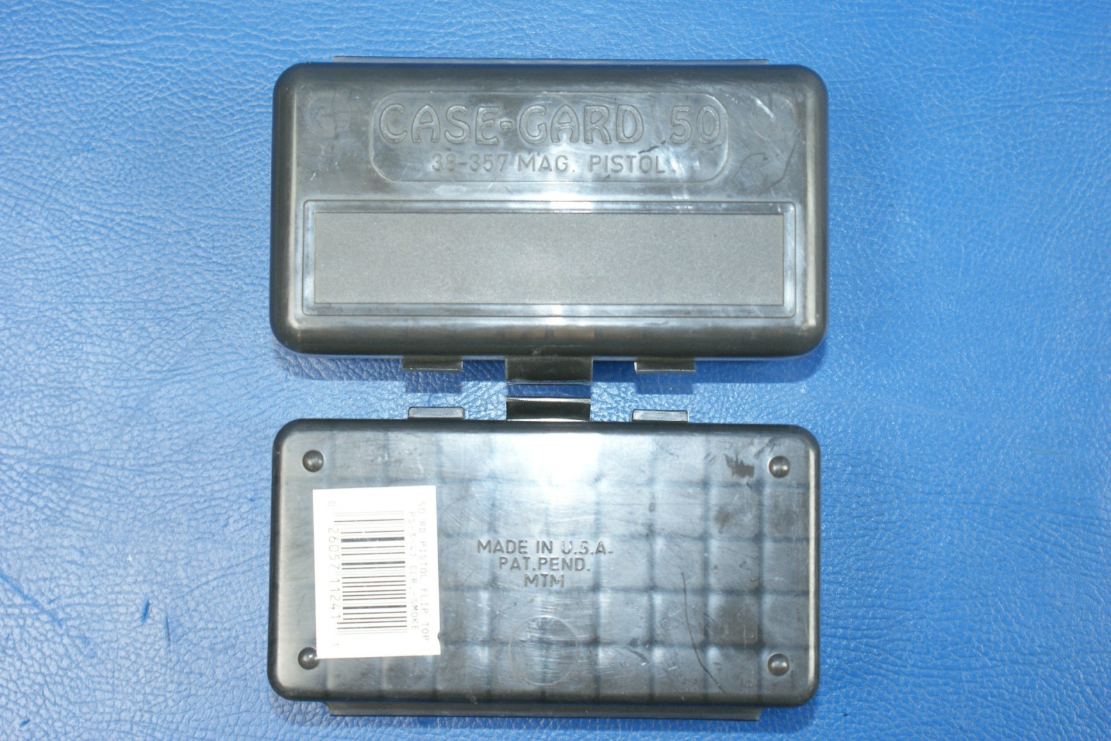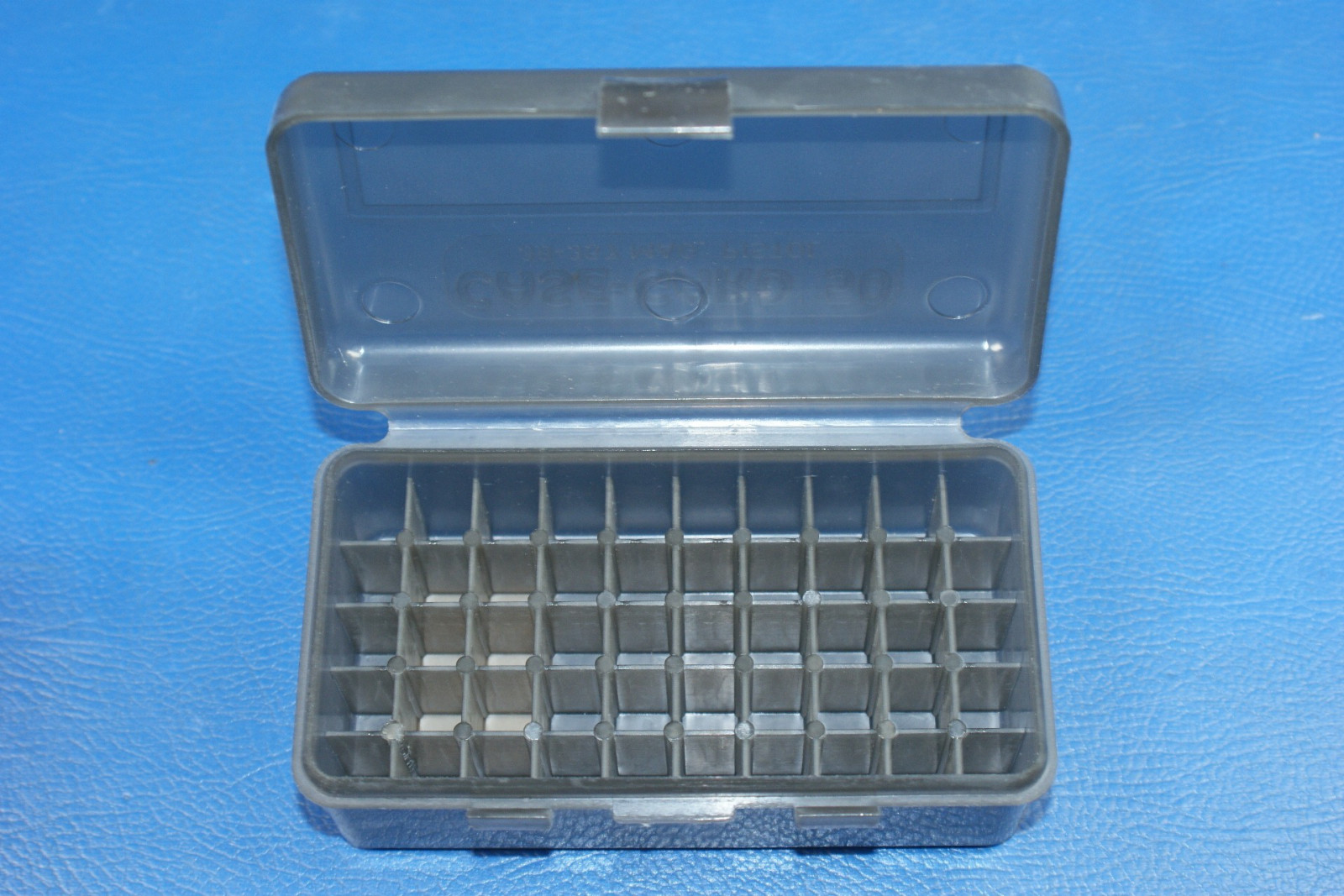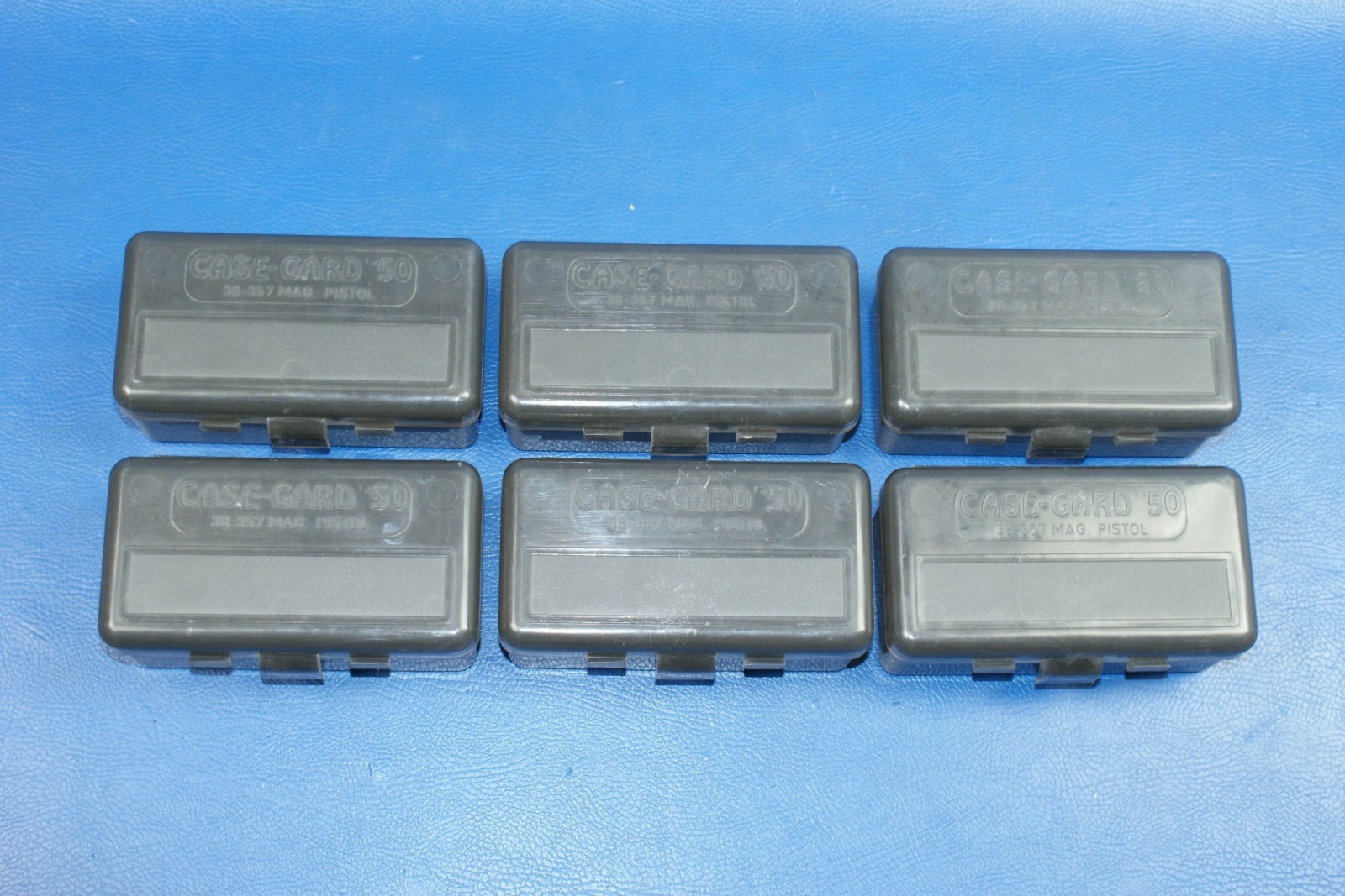 Sechs Patronenboxen der Marke MTM Case-Gard für das Kaliber .38 Special, .357 Mag. Die Patronenboxen sind durchsichtig, wodurch die Menge an Patronen von außen ersichtlich ist.