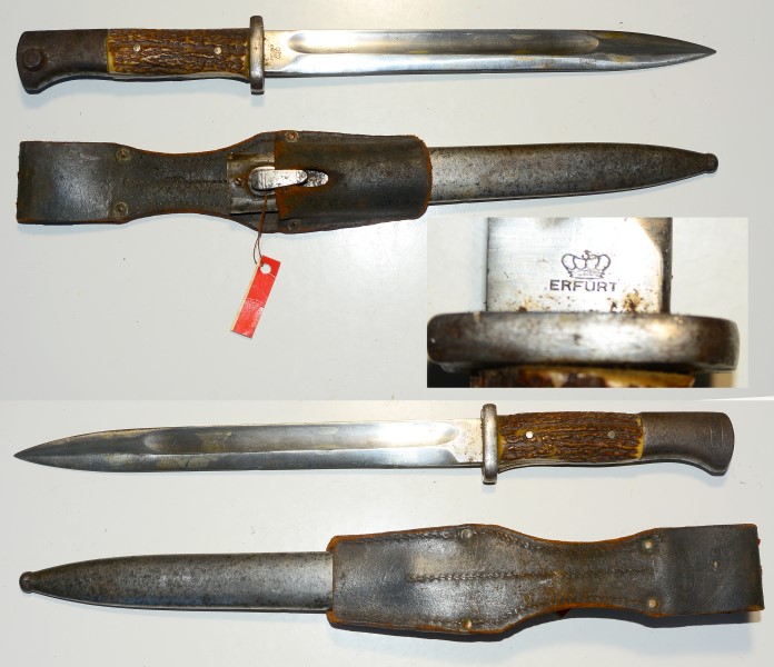 deutsches Bajonett 84/98, 1. Weltkrieg, Hersteller "Erfurt", auf Klingenrücken "W15", Hirschhorngriffschalen, Knauf und Scheide etwas fleckig, Koppelschuh am Koppelhakenloch ausgerissen, ansonsten guter Zustand