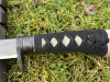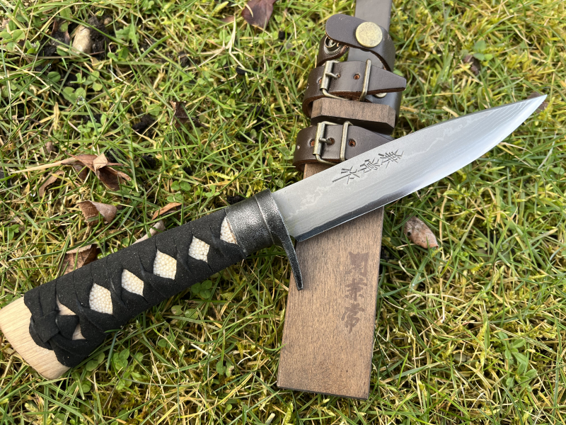 Griff ist aus Holz mit echter Same (Rochenhaut) unterlegt. Die Wicklung ist echtes Wildleder und wurde traditionell auf japanischer Art mit Hand gewickelt. Die Wicklung sitzt sehr streng und liegt unglaublich gut in der Hand.