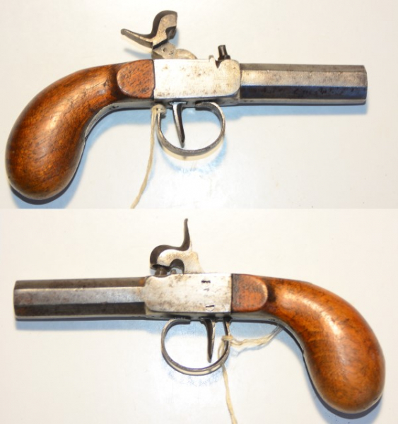 Terzerol, wahrscheinlich aus Frankreich, kein Beschuss aber Waffennummer, Lauflänge 59 mm, Gesamtlänge 16,5 cm, fester Achtkantlauf mit einem Kaliber von 11,5 mm, leichte Altersspuren und technisch völlig in Ordnung