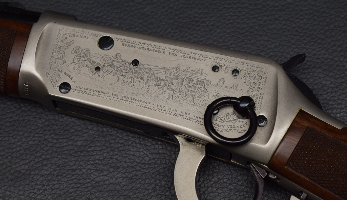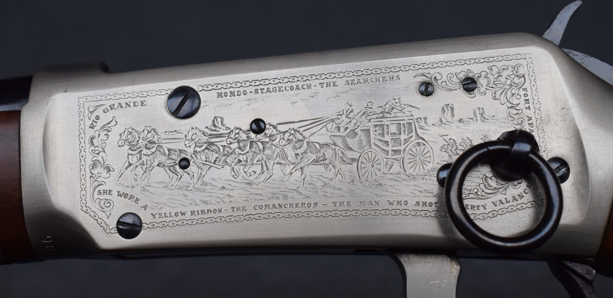 wie Postkutschen-Überfälle und Viehtriebe, sowie die Titel seiner bekanntesten Werke. Ausstattung: Die Waffe verfügt über einen Large Loop (extra großer Unterhebel),