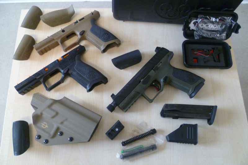 Kompensator, Ersatzmagazin, Magazinladehilfe, Holster, Ersatzteile und ein verbauter Crocodile TR1-Abzug.