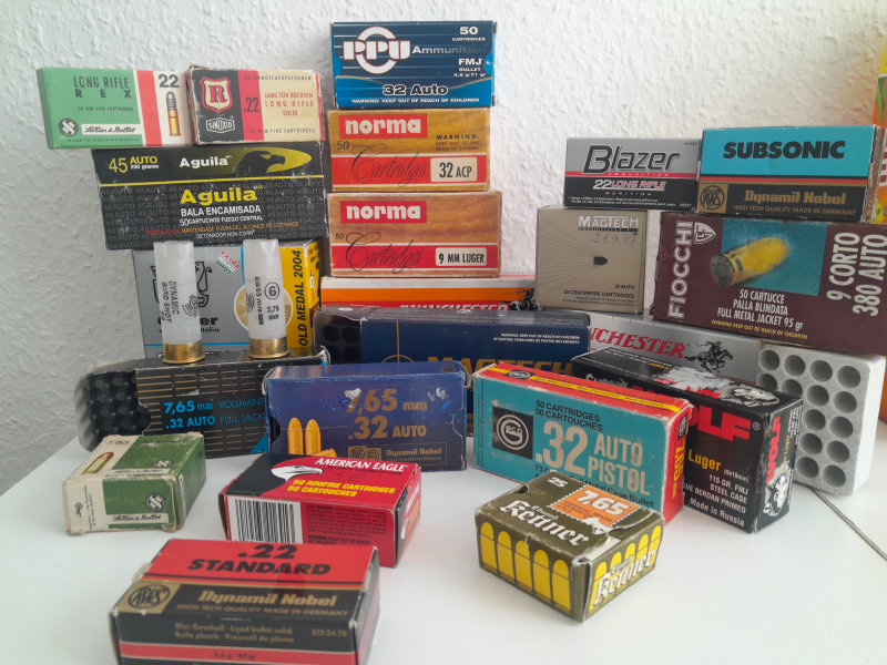 Hauptsächlich 9x19 , 7,65 Browning, 22 lfb usw. ( auch ältere Schachteln dabei ( Kettner )