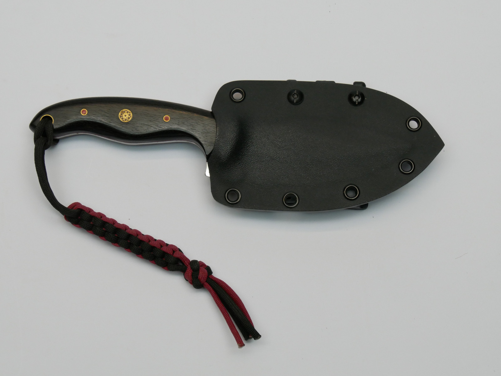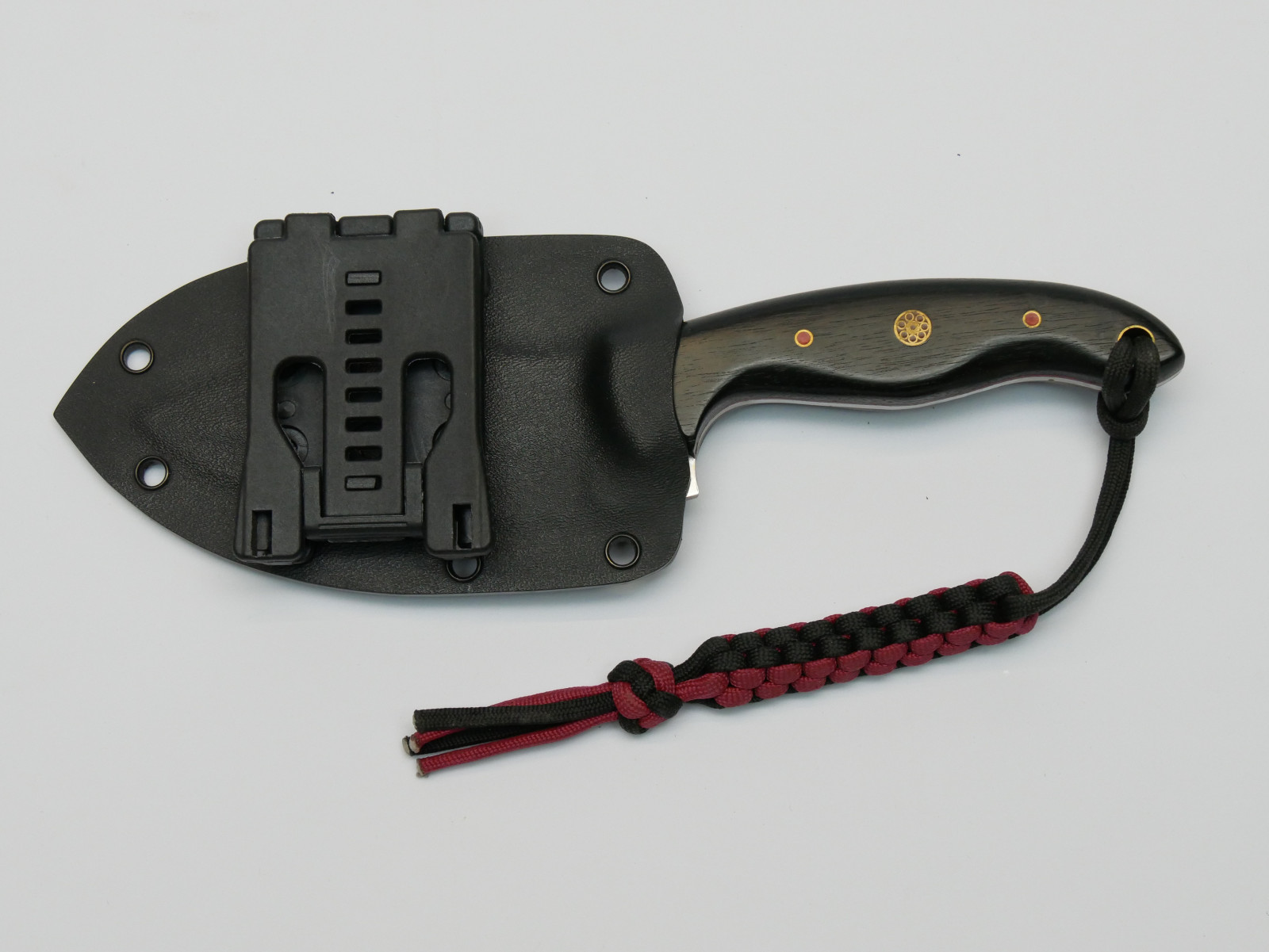 Hier biete ich ein wunderschönes Unikat vom "Messermacher" HF mit sehr geschmeidigem, Edelholfgriff mit Intarsien an. Die Kydexscheide lässt sich individuell verstellen.