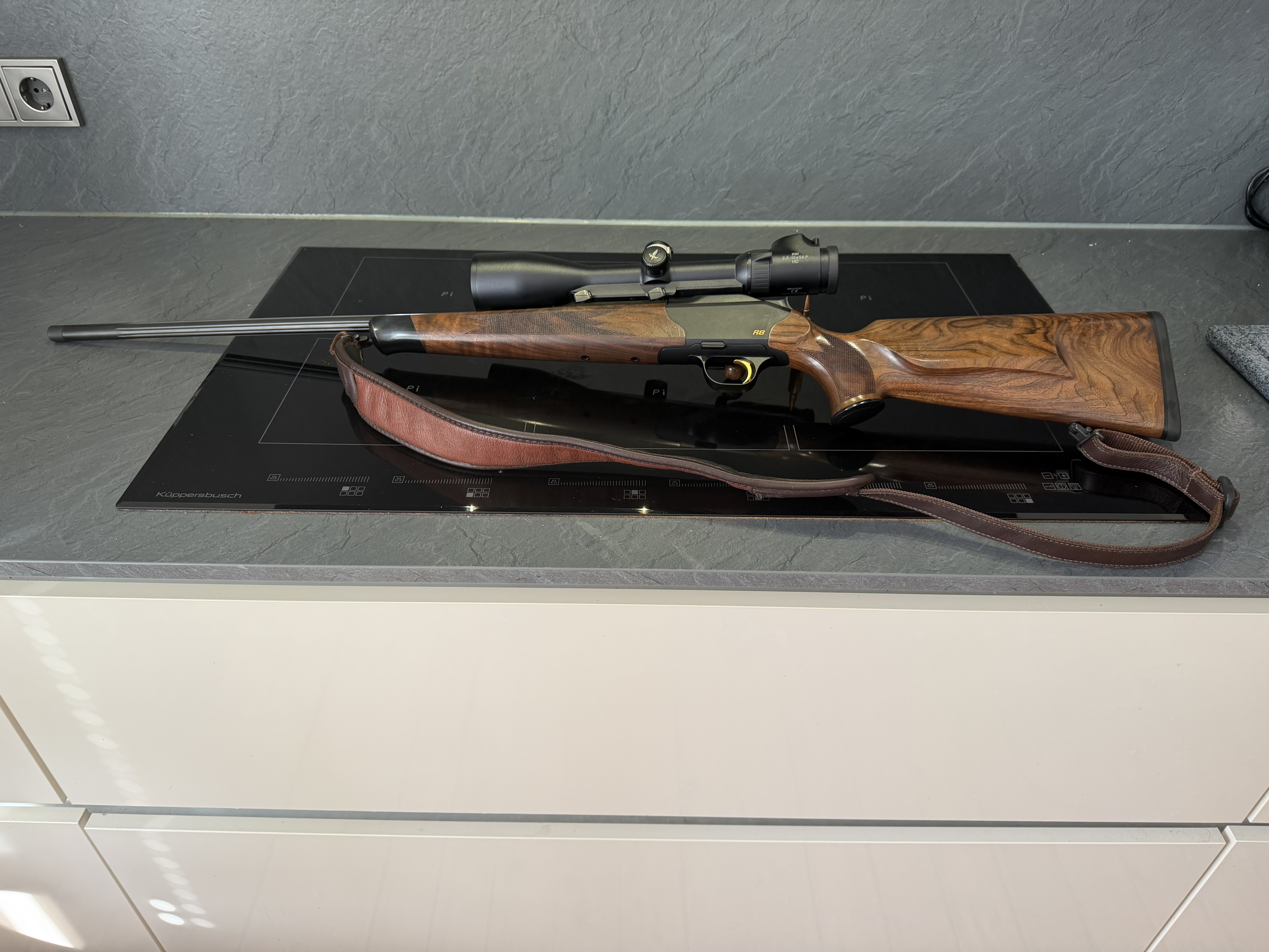 Zur Auktion steht eine selten geführte Blaser R8 in der HK 4 mit schwarzem Kasten und goldenem Abzug. Bayrische Backe. Der Riemen ist die Ledervariante von Blaser.