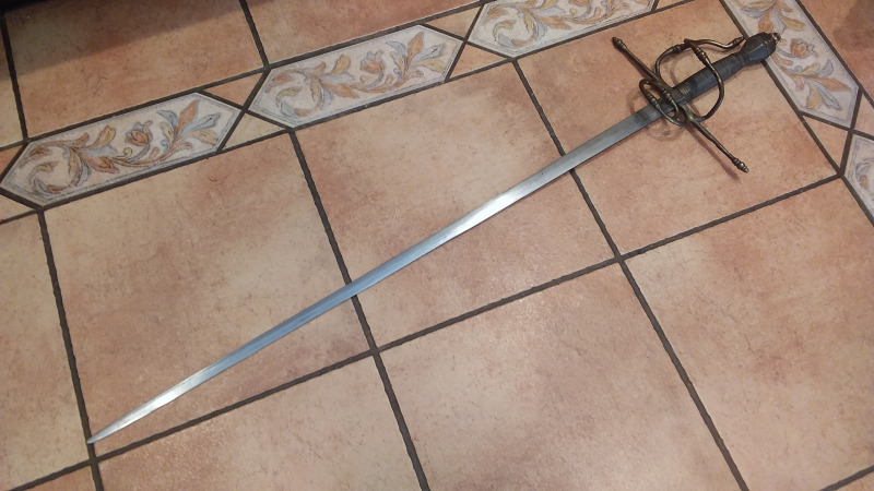 Rapier mit ca. 1,00 m Länge Klingenlänge ca.81 cm, Klinge leicht fleckig, Gefäß ziemlich dunkel angelaufen (siehe Foto), keinerlei Kennzeichnungen an Klinge bzw. Gefäß (ev.Historismusstück?) Privatverkauf, keinerlei Gewährleistungs-bzw. Garantierechte. Auslandsversandkosten bitte erfragen.