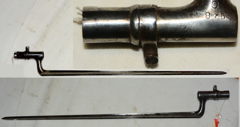 Tüllenbajonett mit 4-Kant-Klinge, Klingenlänge 51cm, Gesamtlänge 59,3 cm, für Lauf-Außendurchmesser 18mm, rechte Tüllenseite kleine Närbchen ansonsten sehr guter Zustand
