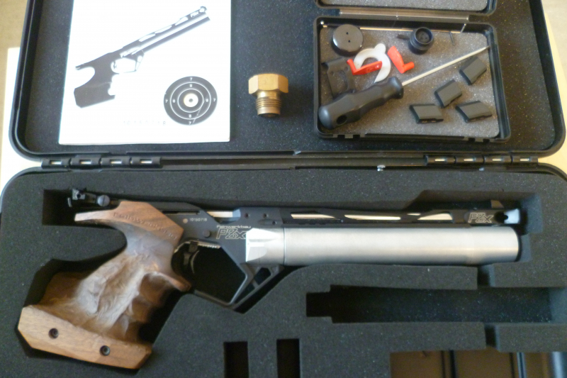 Zubehör: Transportkoffer, Werkzeug, Fülladapter, Laufgewichte, Bedienungsanleitung (fehlt die letzte Seite) und Schussbild.