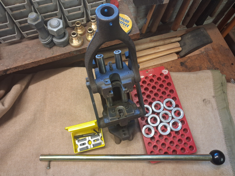 Verkaufe hier ein Wiederladepresse aus Nachlass. Zu der Presse gibt es noch 9 Schnellwechselringe und ein Hülsenbrett. Anstelle des Original-Hülsenhalters wurde eine Platte zur Aufnahme von Shell Holdern montiert. Zum Typ kann ich wenig sagen, da ich nichts vergleichbares gefunden habe (ist ähnlich einer CO AX, die aber rot ist). Die Presse läuft sehr leicht und hat einen langen Hebel. Warum die Hülsenaufnahme geändert wurden, kann ich nicht sagen. Ich bin keine Wiederlader und habe die Presse auch nicht ausprobiert.