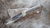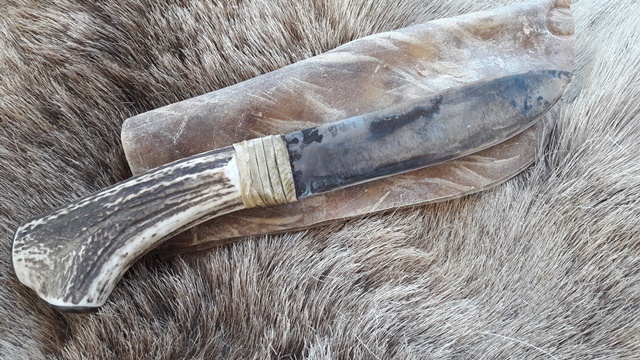 Handgeschmiedete Mountain- Man Messer , mit Hirschgeweih Griffschalen, klinge 160 mm lang, Gesamtlange 305 mm, Schiede aus Rohhaut bereit zur Dekoration/Bemalen im indianer Stil, mit kleine Schmiedespurren / Handforged Mountain-man knife , handle from deer antler, sheath from cow rawhide, prepared for decoration in native style, painting etc. , blade 160 mm long, total lenght 305 mm.