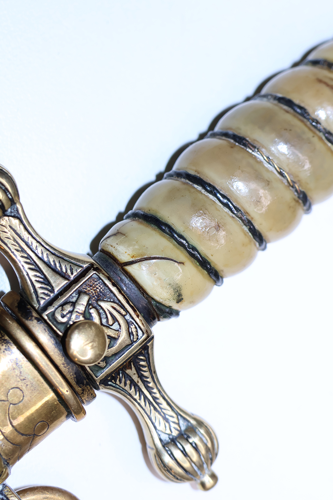 Die Klinge ist stark beansprucht, und der Griff weist Risse auf. Es sieht so aus, als ob der Griff lackiert wurde.