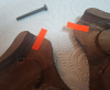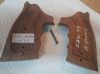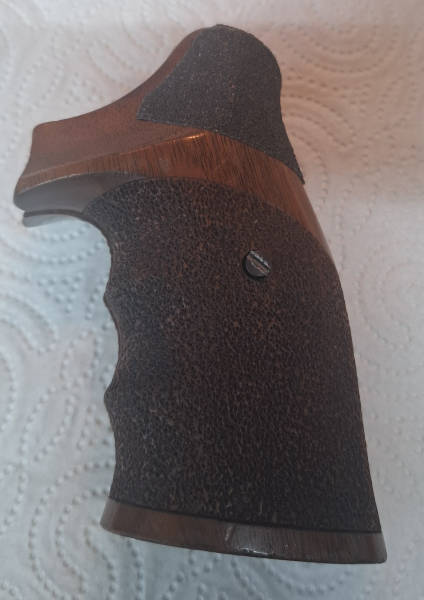 Karl Nil Holzgriff Nussbaumholz Griffschalen für Smith & Wesson Revolver mit N-Rahmen round butt. Die Griffschalen haben (jede) im oberen Bereich einen Riss, der auf der Innenseite mit Sekundenkleber augegossen wurde ( rote Markierungen auf einem der Bilder). Außen im Daumenbereich wurde jeweils ein Stück Skateboardtape aufgeklebt.