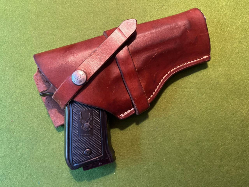 aus Portland, Oregon, biete ich dieses schönes "flap" Holster, mir unverständlich kodiert, aber offensichtlich passend für die im Auktionstitel angegebene Waffenfamilie wie z.B. diese