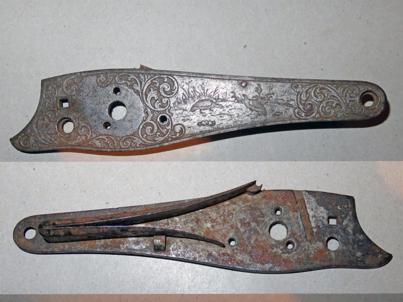 Fein gravierte Schlossplatte (Jagdmotiv Rebhühner Ornamentik) mit intakter innerer Hahnfeder, andere Teile fehlen, von einem Stein oder Perkussionsschloss.