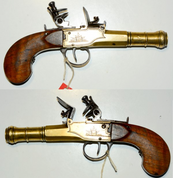 Steinschloss-Terzerol mit Messingkasten und -lauf, keine Beschusstempel daher wahrscheinlich französisch, Lauflänge 73 mm, Gesamtlänge 19,5 cm, Kaliber 11,5 mm, guter funktionsfähiger Zustand