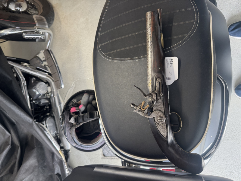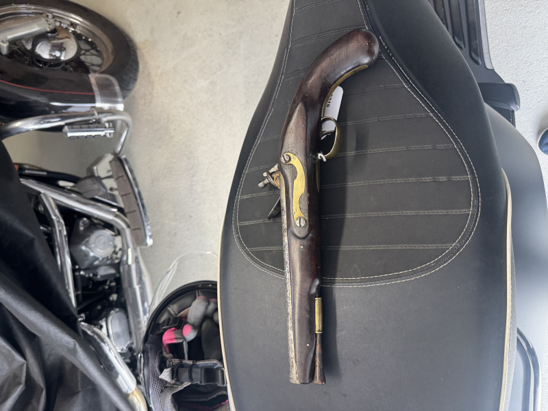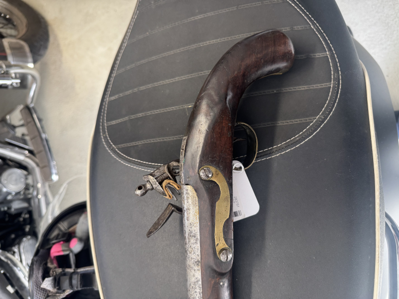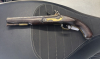 Steinschlosspistole, Kolonialmodell, Kal. 18mm LL 230mm, TL 390mm, Rundlauf, flache Schlossplatte, eiserne gerundete Pulverpfanne, Hahn mit Durchbruch. Nussholzschäftung mit Reparaturstelle im Mündungsbereich. Messinggarnitur und hölzerner Ladestock