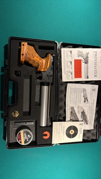 Ich biete hier aus Privatbestand: Pressluft Matchpistole Röhm Twinmaster Matchgriff, Kaliber 4,5mm/.177 mit ergonomischen verstellbarem Rechtsgriff und Zubehör wie auf Bildern erkennbar!