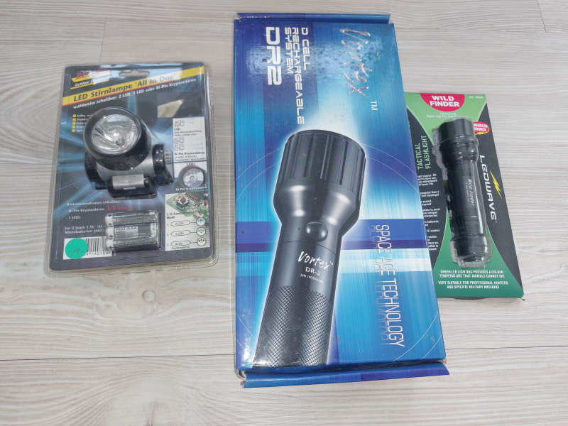 Lampenset bestehend aus 3 Taschenlampen: Kopflampe, Lampe mit Akku und Taschenlampe mit grünem Licht