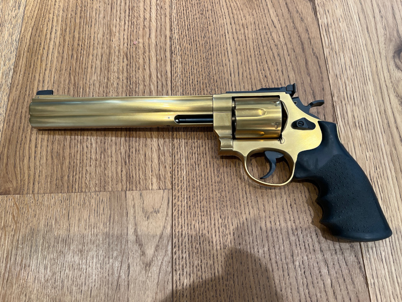 Versteigerung eines Club 30 S&W Classic DX 44 Magnum Revolvers in Farbe „Duotone Tin“ Beschichtung Gold mit schwarz. Mitgeliefert werden: Insgesamt 4 Griffe, Montage für ZF - Dot’s o.ä, 3 Visierungen – original 44, LPA und die serienmäßige grün/rote Club30 Visierung mit Glaseinsätzen. Feder zur min. des Abzugsgewichts. OVP Koffer. Inkl. 650 Schuss Geko Teilmantel 240gr. Eingesetzt bei Diszi Super Magnum BDMP. Mindestimpuls 1200J immer übertroffen. Eine absolut einmalige Gelegenheit noch solch ein Sportgerät erwerben zu können. Erstbesitz - Kauf 06/2018. Schussbelastung ca. 1.000 Schuss. In super gepflegten Zustand und nur für empfindliche Naturen, mit minimalsten Gebrauchsspuren. Dabei sind auch Gürtel mit Holster und 6x Speedloader. Für das Ganze über die Jahre zusammengetragene Paket; Preis ca. 4.000,--€. Bei Fragen, bitte vor Ersteigerung fragen! Bieten Sie nur mit, wenn Sie mit u.s. Ablauf einverstanden sind. Verkauf nur an EWB. Besichtigung nach Vorlage EWB und Ausweis ausdrücklich erwünscht. Gerne Selbstabholung. Versendung Overnight oder Äquivalent für Sportgerät, Munition, Gürtel + Speedloader = 150,--€ . Kein Auslandsversand – No International Shipping! Nach Ersteigerung ist der gebotene Kaufpreis und Versandkosten vollständig und innerhalb von 5 Tagen zu entrichten. Das alles ab 1,--€. Ich muss wohl gaga sein ;-)