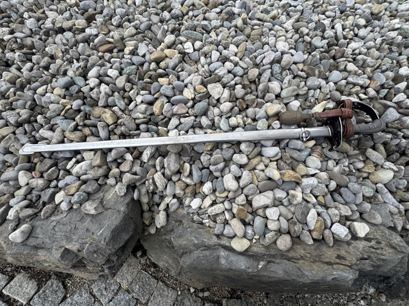 Offiziersdegen 1899, unberittene Offiziere KL 855mm, TL 1000mm, Gr. III. Griff fischhautbespannt, Korb durchbrochen mit Eidg. Kreuz auf der Aussenseite. Zweibahnenklinge, Herstellerstempel "E. & F. Hörster, Solingen", volle Wurzel, Stahlscheide mit Ringöse, rotes Lederschlagband Ord. 1877.