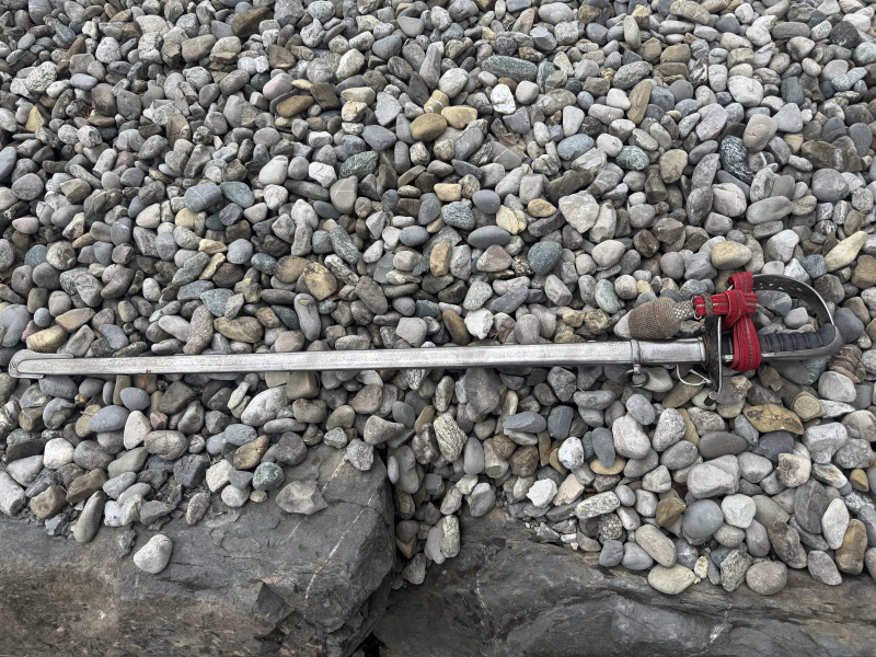 Offiziersdegen 1899, Waffenfabrik Neuhausen, Gr. II KL 810mm, TL 960mm. Griff fischhautbespannt, Gefäss mit altersbedingter Patina, Korb durchbrochen mit Eidg. Kreuz auf der Aussenseite. Zweibahnenklinge, Schweizer Abnahmestempel Kreuz im Kreis, 41, Stahlscheide, Ringband mit Ring und Tragöse. Rotes Schlagband Ord. 1877/85