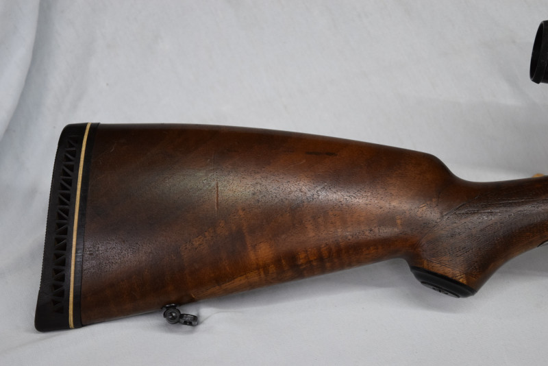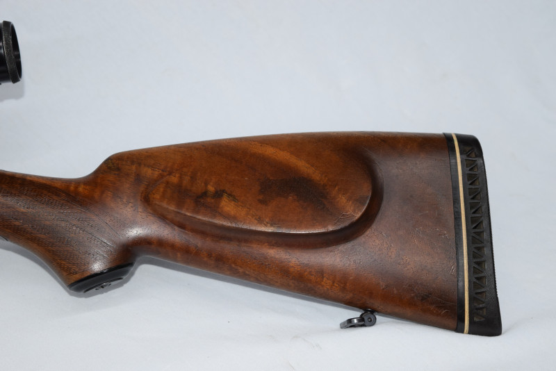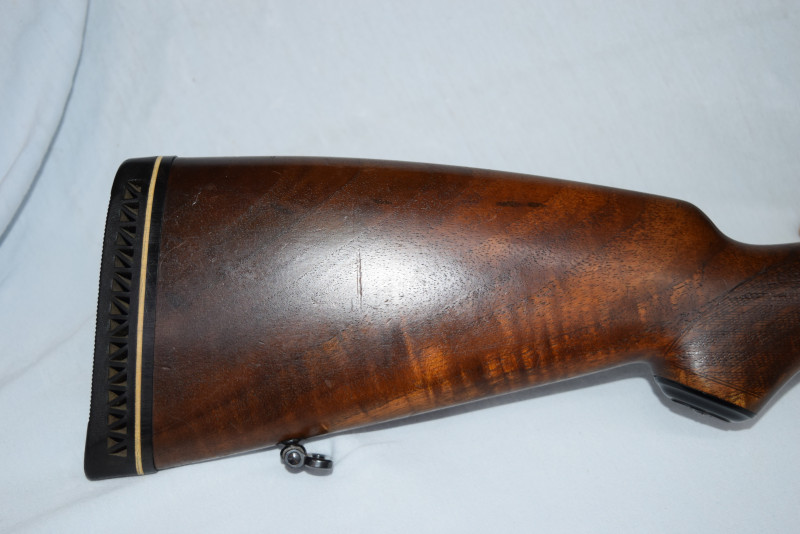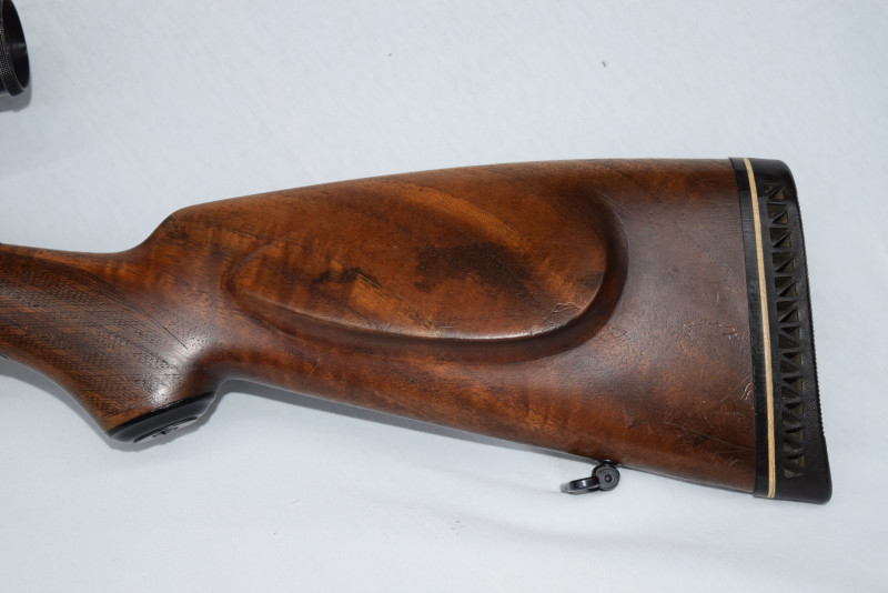 Guter und wertiger Nussholzschaft mit Backe und mit Riemenbügeln.