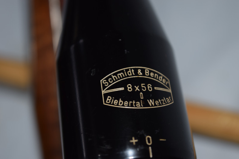 Das montierte Markenzielfernrohr Schmidt&Bender, 8x56 und die Montage verbleiben auf der Waffe.