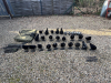 23 beflockte Lockkrähen (bei einigen muss die Beflockung erneuert werden), 6 Elstern, 5 Erdspieße, 4 Teleskopstangen zum Schirmbau, Tarnnetz, Transportsack