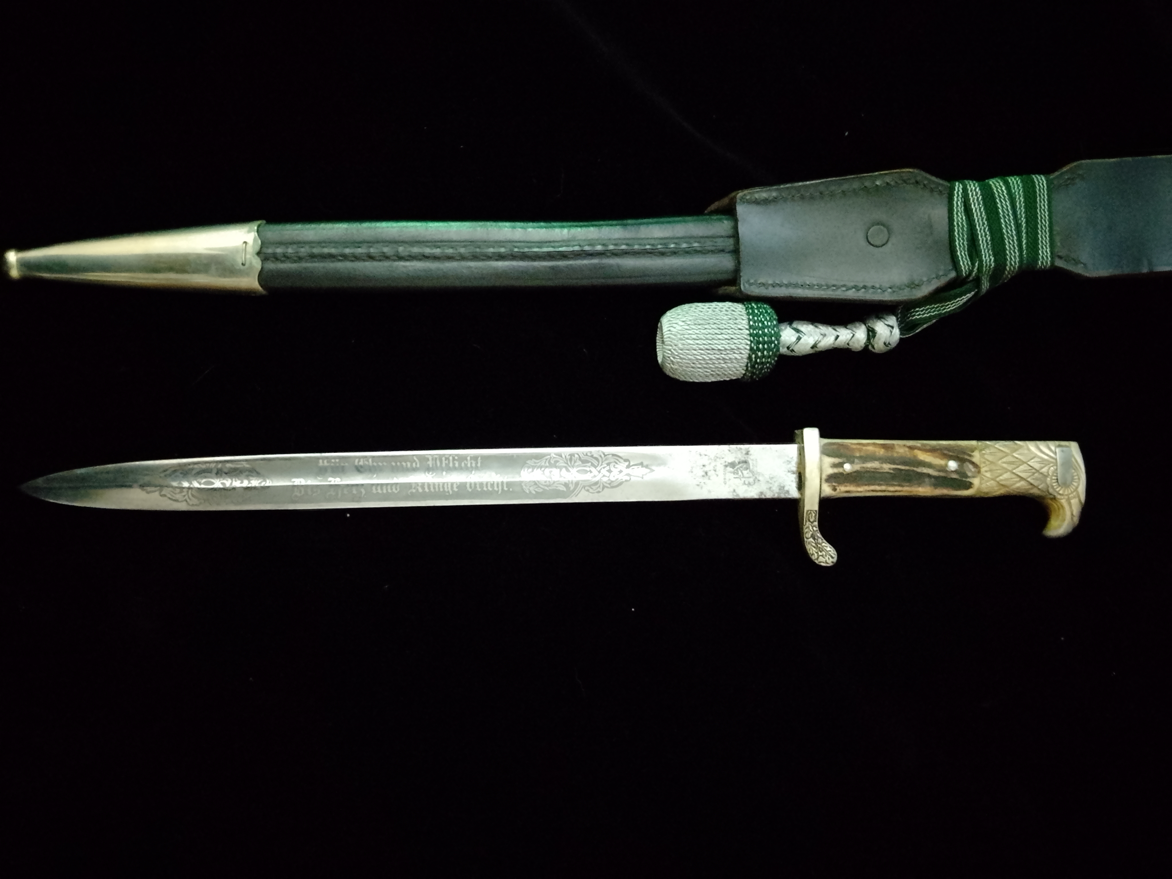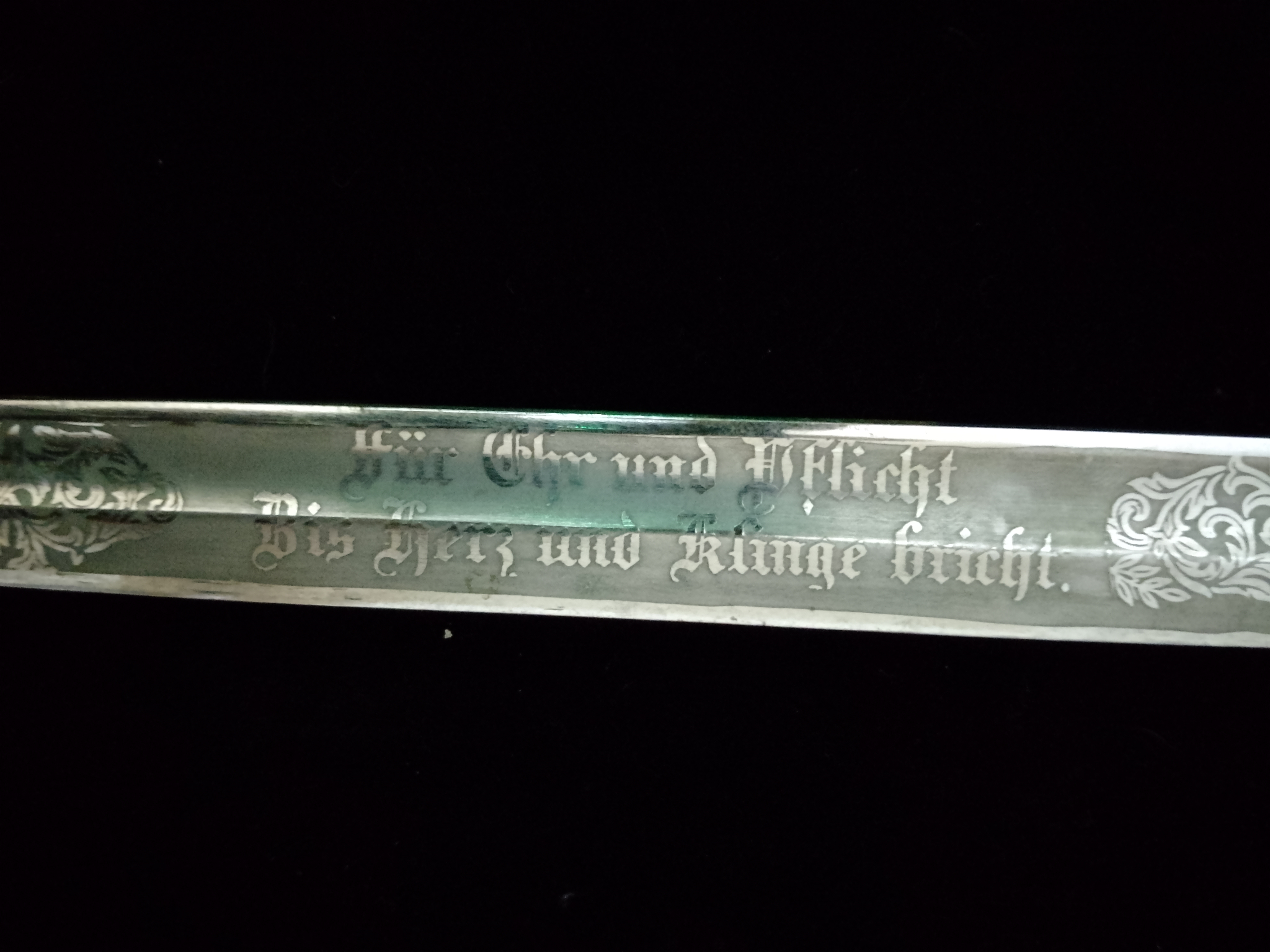 Stahlklinge mit Sonderätzung, vermutlich Privat beschafft, vs Ranken und Hoheitsadler, es Ranken und Sinnspruch.