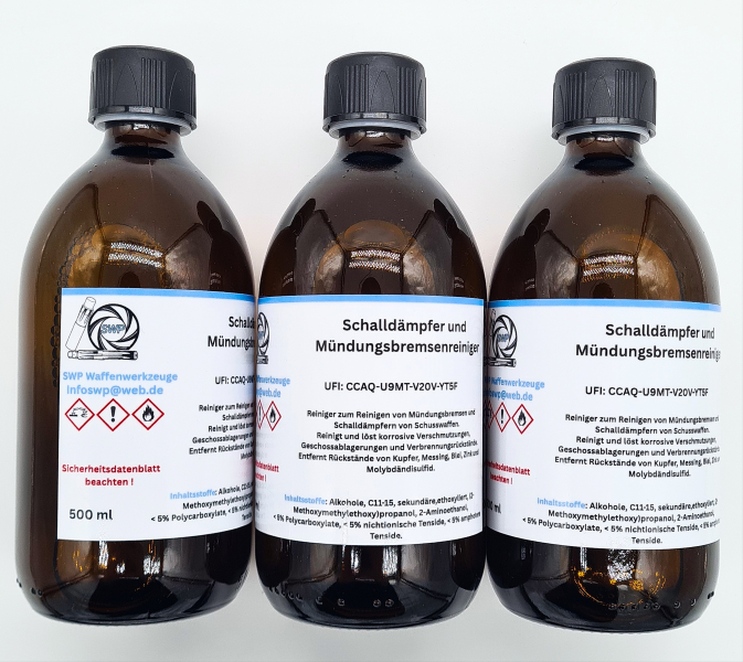 Sie erhalten eine Flasche mit 500 ml unseres leistungsstarken Schalldämpfer- und Mündungsbremsenreinigers.
