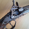 Biete diese uralte Miquelet-Pistole. Meines Wissens nach ist sie italienisch um 1700. Den Knauf und den Abzugsbügel ziert je ein hübsches, eisengeschnittenes Maskaron. Oberflächen ohne Rostnarben, mit schöner brauner Patina. Könnte man sicherlich wieder herrichten, wenn man das möchte. Der Zustand ist nicht so gut - Bestoßungen, Fehlteile/-stellen, Ergänzungen und Restaurierungen. Der Hahn lässt sich nicht spannen (bzw. wohl nur sehr schwer, ich will aber nicht mit viel Kraft daran). Dafür ein schönes, äußerst elegantes Originalstück. Gesamtlänge ca. 51cm.