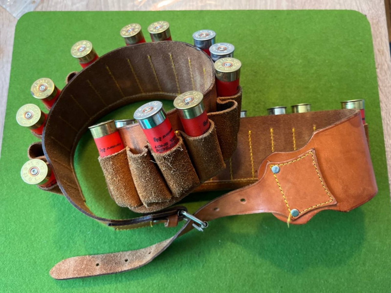 aufwendig gefertigter Jagdgürtel, bestehend aus eine Basis geschmeidigem hellbraunen Leder und einem angenähten Patronenhalter aus schönem Wildleder, hier im Detail