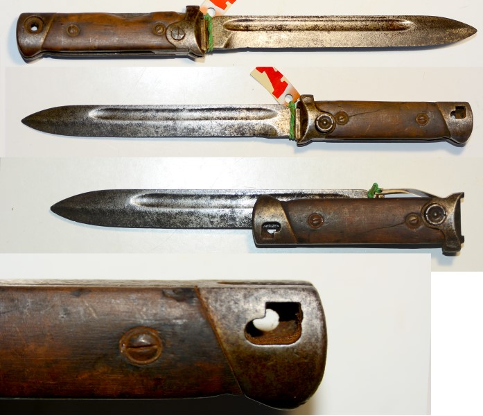 Seltenes Klappbajonett, Italien Modell 1938 in der Ausführung für die Beretta MP, es fehlt der Drücker, Klinge und Griffstück mit Rostflecken, kleiner Ausbruch an rechter Griffschale