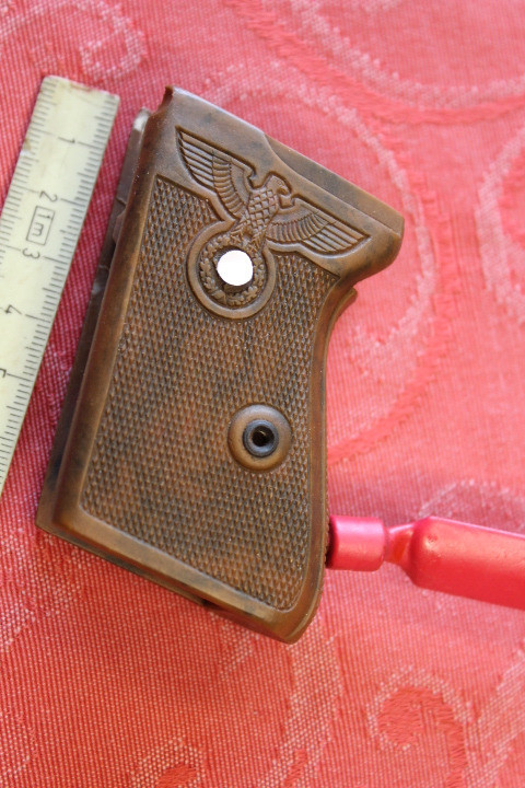Aus Auflösung eines Büchsenmacher Nachlass,war aber schon vor langer Zeit ca 40 Jahre, liegt seid der Zeit bei mir und habe sie jetzt wieder gefunden. Löße teile meiner Privatsammlung altersbedingt auf. Die Griffschale hat eine magnetische Metall Einlage, siehe Bild mit Magnet. Leider kleine Beschädigungen, sind wohl mir durch unsachgemäße Lagerung passiert, siehe Bild. Sonst noch unbeschädigt.