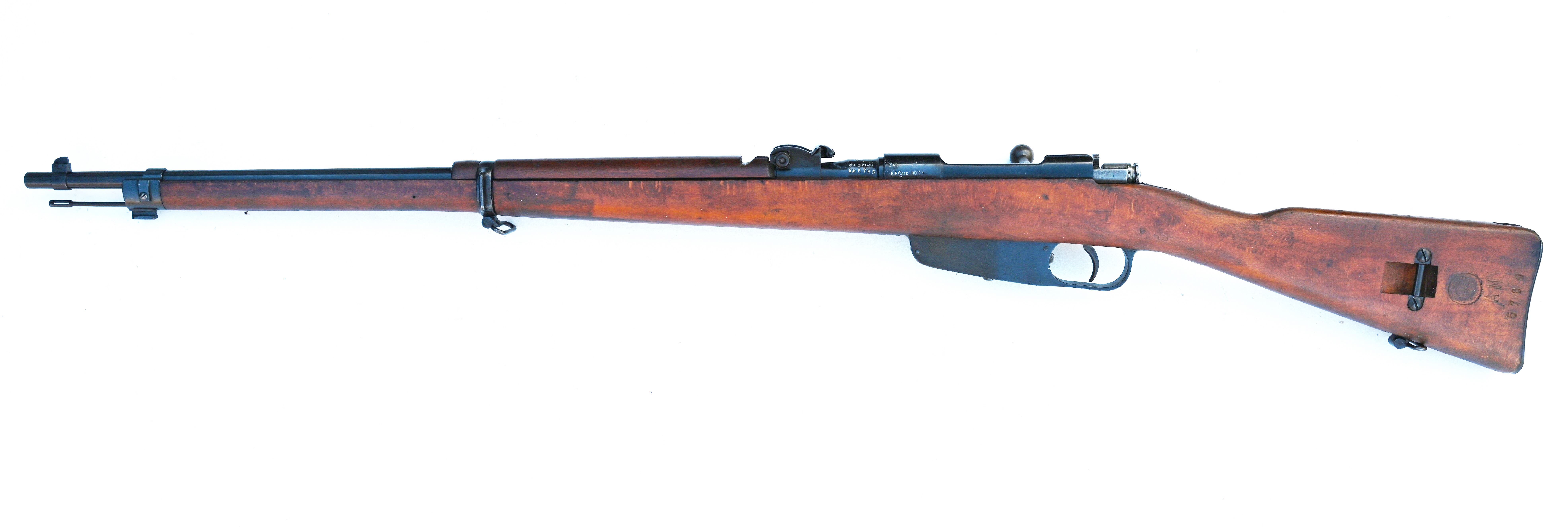 Herstellerangabe „FAT“ über "42" im Rechteck, Kaliberbezeichnung „CAL. 6,5 Carc.“, Seriennummer, alte italienische und gültige deutsche Beschusszeichen von 1971, Importeurzeichen „HEGE“ (= Zeughaus Hege) auf Hülse links. Schloss ohne erkennbare Nummern, nur gestempelt mit Abnahmen. Kreisrunder Schaftstempel "DIREZ ARTIG ROMA 1948" tiptop lesbar, wie auch die Seriennummer "AM5769".