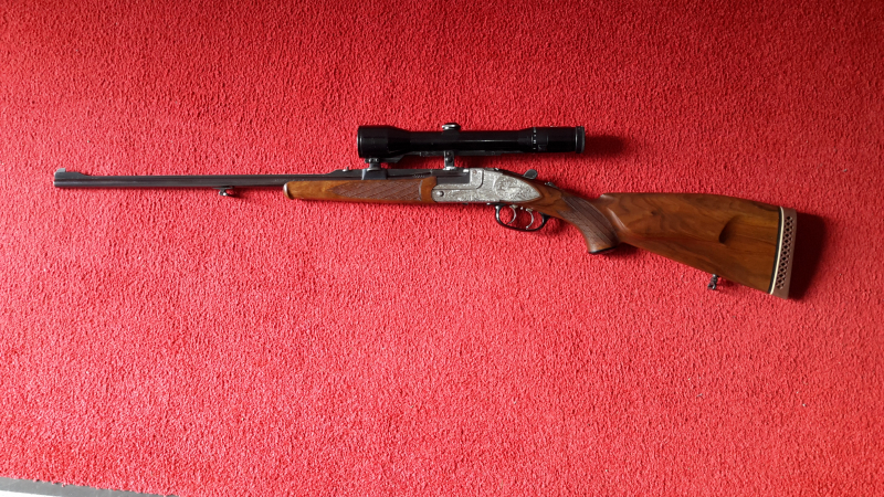 Verkauf meine Sonntagsnachmittagsausgehbüchse w/Aufgabe der Jagd: sehr schöne Kipplaubüchse von Zimmermann, Kaliber 7x65R, montiert mit SEM ist ein Zeiss 1,5-6x42 ZF Abs. 1mit verjüngendem Stachel. Die Waffe hat einen Greener Verschluss und eine Besonderheit: sie wird mit dem Öffnungshebel gespannt und kann deshalb mit etwas Übung wie ein Handspanner geführt werden. Die Waffe wurde zum 50. Geburtstag eines Pforzheimers Unternehmers mit sehr schönen Verzierungen auf den langen Seitenplatten gefertigt. Sie wurde kaum geführt, Sehr gute Schussleistung mit RWS TIG. Bei Abholung gibt es noch ca. 50 Schuss Munition dazu. Verkauf erfolgt gebraucht von Privat, ohne Gewährleistung und ohne Rückgabe nur an EWB.