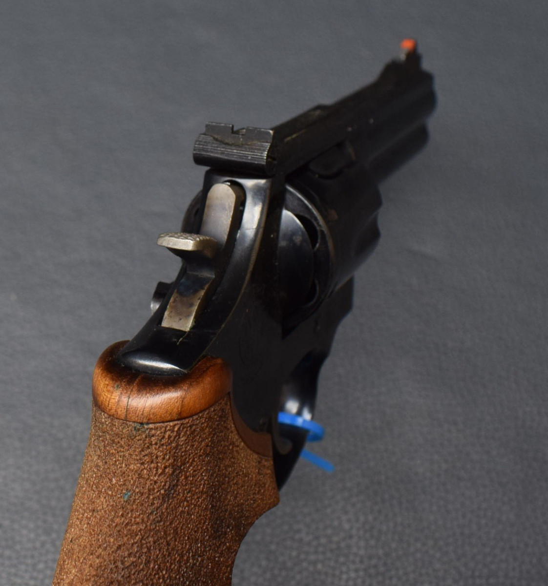 SA/DA Abzugssystem, L-Rahmen, 6-Schuss Trommel, Holzgriff mit Daumenauflage und Fingerrillen.