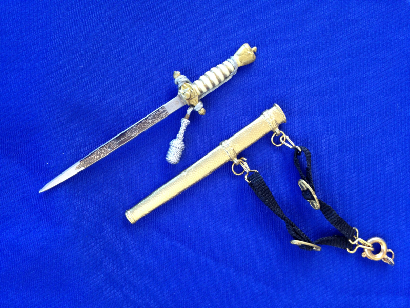 Miniaturdolch der Kriegsmarine ( 3. Reich ) zu verkaufen. Zustand tadellos. Mit HK auf der Vorderseite. Länge, mit Scheide, 7,3 cm. Ansonsten siehe Bild ( Teil der Beschreibung).